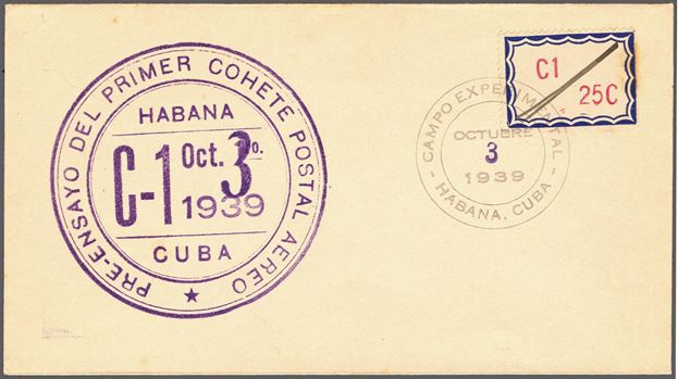 В первую ракету уложили 70 писем франкированных маркой, с надпечаткой и надписью «PRIMER COHETE AEREO, 1939» (Первая почтовая ракета, 1939). На обшивке написали «C-1». На конвертах наклеили служебные марки кубинской почты номиналом в 25 сентаво. Конверты также были погашены круглым штемпелем «Preensayo del primer cohete postal aereo» с указанием места и даты, а также испытательного предназначения запуска.