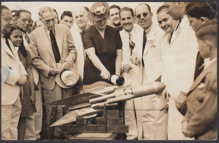 На фото изображен момент, когда Тете Риверо де Ферран, жена прокурора Гаваны доктора Рене Феррана, приступила к инаугурации этого нового почтового процесса доставки писем ракетой.