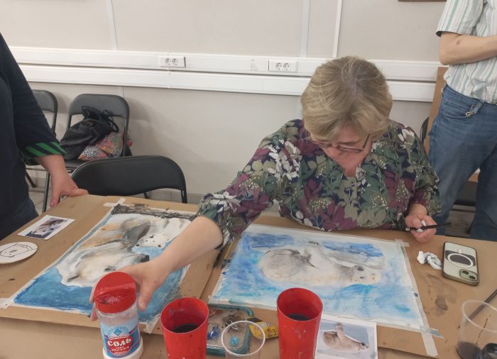Так, подождите. А где же соль и скомканная бумага? Все это нам понадобилось во второй части встречи, когда художник, арт-педагог и арт-терапевт Юлия Белокрылова предложила нарисовать белого медведя.