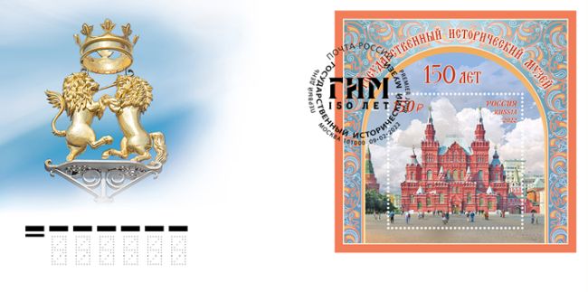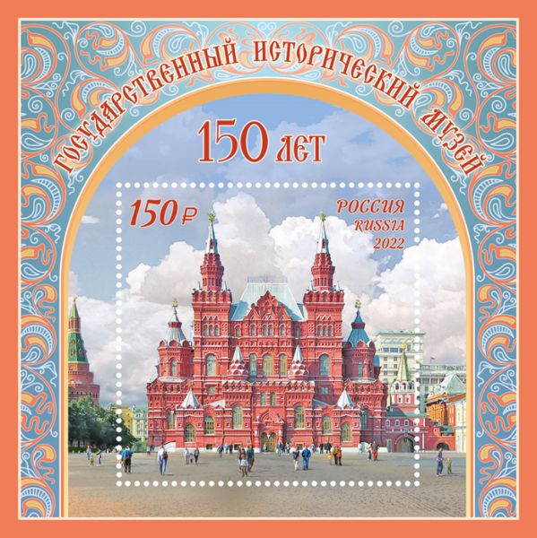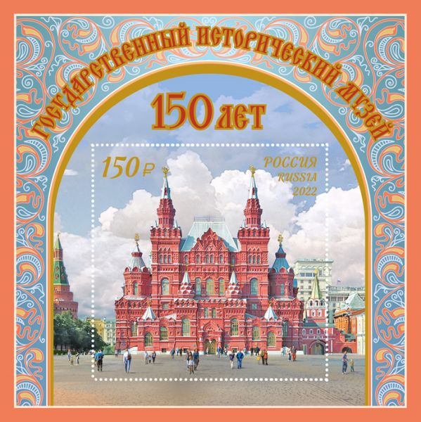 Этот же фасад демонстрирует и почтовый блок №2869 «150 лет Государственному историческому музею», который к 9 февраля 2022 года подготовила художник-дизайнер О. Савина. В этот год праздновался полуторавековой юбилей со дня основания музея согласно решению российского императора Александра II. Ещё 3 года ушло на проведение конкурса проектов музейного здания и утверждение проекта-победителя. И поэтому только сегодня мы празднуем полтора века со дня закладки первого камня всемирно известного здания.