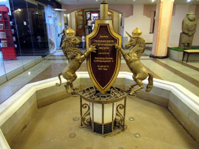 В фойе первого этажа Исторического музея установлен памятный знак, посвящённый моменту, когда российский император Александр II заложил первый камень в основание музейного здания 20 августа 1875 года. Щит с памятной надписью бережно удерживают в вертикальном положении позолоченные фигуры льва и единорога.
