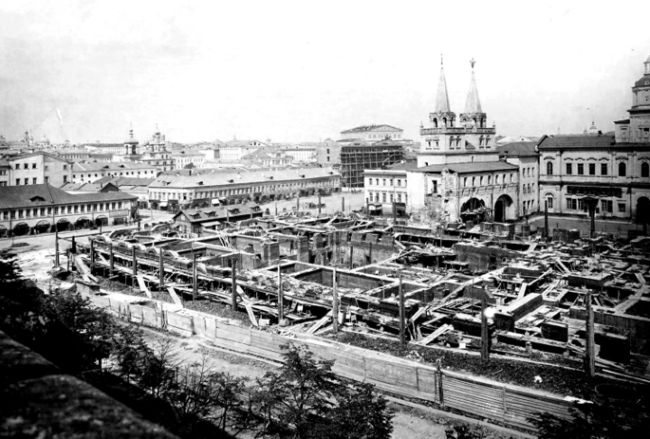 Чёрно-белые фотографии 1875–1876 годов показывают цокольный этаж строительства музея. Воскресенские ворота, воспринимавшиеся современниками как единый ансамбль с музейным зданием, доминируют на обоих снимках. Если бы на первом из них не было здания Богоявленской церкви в одноимённом переулке, а на втором — здания Большого театра, которое выдаёт только квадрига Аполлона на нижнем фронтоне, окружающий пейзаж вряд ли бы отличался особой узнаваемостью.