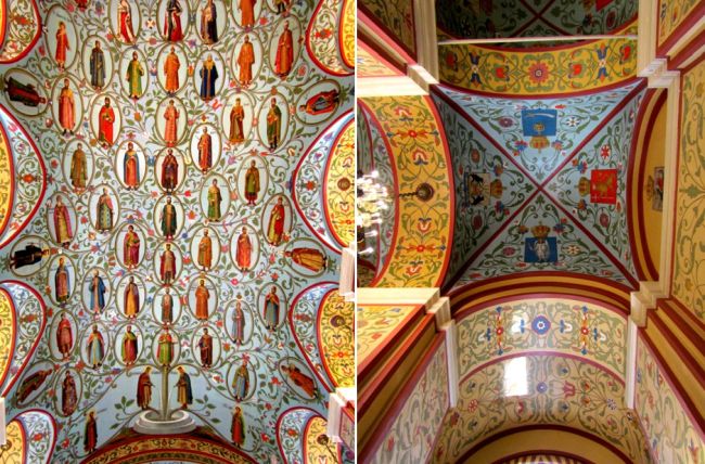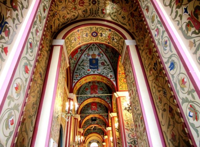 Особенно обворожительны парадные сени Исторического музея, потолок которых украшен генеалогическим древом царствовавшей династии. В боковых нефах на сводах размещены гербы старинных городов Российской империи.