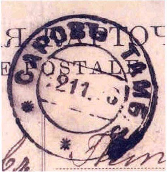 Настораживает отсутствие на оттиске обязательной литеры (буквы), по которой определяется количество действующих в отделении штемпелей. Надпись расшифровывается так: «Почтовое отделение поселка Саров Тамбовской губернии Российской империи». Заметим, что к 1910 году отделение перестало быть телеграфным, и в Сарове стал использоваться штемпель нового образца со строчной календарной датой.