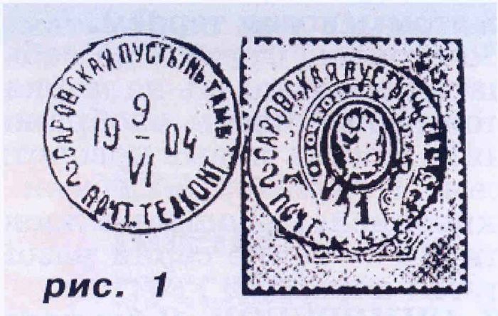 Второй оттиск взят из той же статьи — с открытки, прошедшей почту Сарова в 1910 году. На рис. 2 показан этот оттиск и слева его реставрация.
