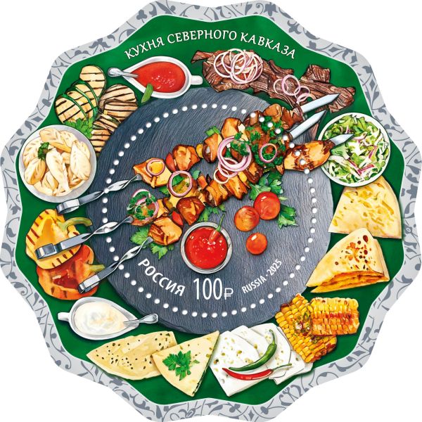 На почтовой марке изображён шашлык на шампурах с овощами и соусом; на полях блока — запечённые овощи, сыр, пироги, лепёшки, мясо и хинкал.Дополнительно к выпуску почтовых блоков изданы конверты первого дня и изготовлены штемпеля специального гашения для Москвы и Пятигорска Ставропольского края, а также картмаксимумы.