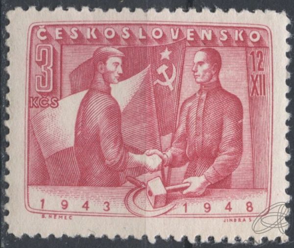 Это невзрачная почтовая марка посвящена политическому документу, заключенному между СССР и Чехословакией 12 декабря 1943 года. На миниатюре изображены анонимные персоны. Но как это было возможно в 1943 году, когда одной из стран договора не существовало?