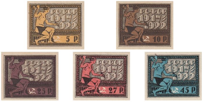 К первой годовщине Великой Октябрьской социалистической революции были выпущены первые марки РСФСР, получившие название «Рука с мечом».