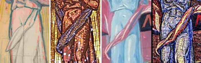 Чередуя эскизы и существующие ныне мозаики, позвольте показать, насколько схожи даже движения ступней женщины, символизирующей мир и Родины-матери. Скорее всего, такое сходство Корин придал своим героиням в качестве смыслового рефрена, тем более что станции, на которых эти мозаики помещены, разделяют только Достоевская и Проспект Мира-кольцевая.