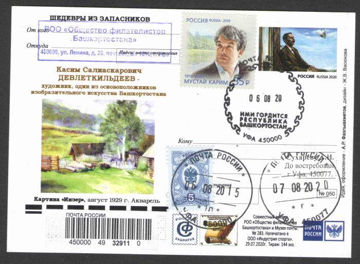 ПК № 283. Шедевры из запасников. К.С. Девлеткильдеев (1887-1947). Инзер. 29 июля 2020 г. Тир.: 144 экз. Номерная. Карточка прошла почту. Основная м. погашена СШ-лем «Ими гордится Республика Башкортостан», доплатная - обычным КШ-лем. На ПК – виньетка с портретом живописца, логотипы ОФБ, музея почты и АО «Почта России».