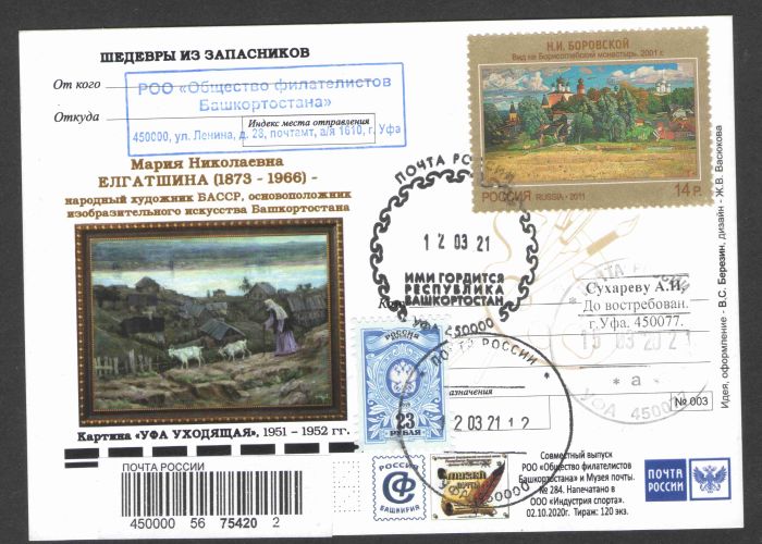 ПК № 284. Шедевры из запасников. М.Н. Елгатшина (1873-1966). Уфа уходящая. 2 октября 2020 г. Тир.: 120 экз. Номерная. Карточка прошла заказную почту. Основная м. погашена СШ-лем «Ими гордится Республика Башкортостан», доплатные, в т. ч. и на обороте - обычным КШ-лем. На ПК отпечатаны логотипы ОФБ, музея почты и АО «Почта России».