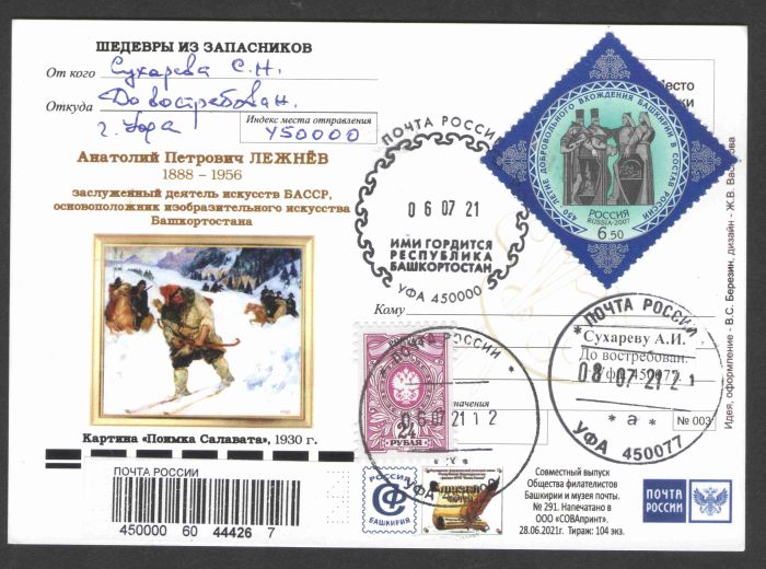 ПК № 291. Шедевры из запасников. А.П. Лежнёв. (1888-1956). Поимки Салавата. 28 июня 2021 г. Тир.: 104 экз. Номерная. Основная м. на почте погашена СШ-лем «Ими гордится Республика Башкортостан», доплатные, в т. ч. и на обороте - обычным КШ-лем. На ПК отпечатаны логотипы ОФБ, музея почты и АО «Почта России».