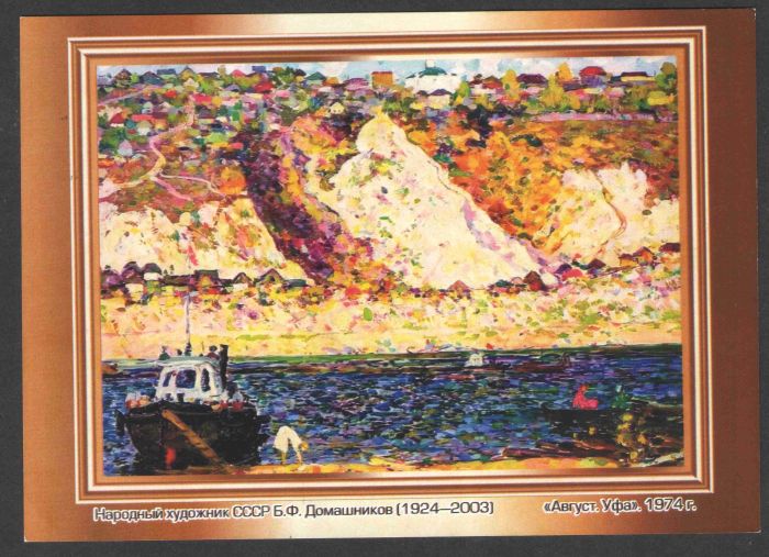 Ему мы посвятили открытку с изображением обрывистого берега Белой с усыпанными деревянными уфимскими домиками. Отметим, что визитной карточкой Домашникова слыли берёзовые рощи и перелески, трепетные, пронизанные светом, которые он писал всю свою жизнь. И ещё. Улицы Уфы на протяжении всего творчества привлекали художника.