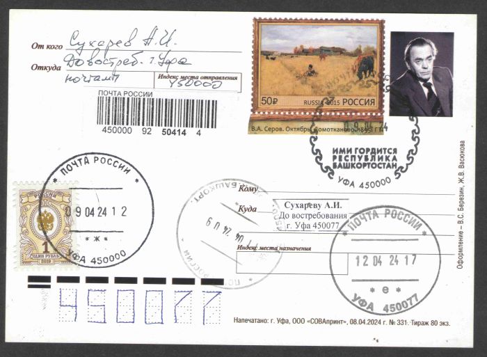 ПК № 331. Народный художникок СССР Б.Ф. Домашников (1924-2003). Август. Уфа. 8 апреля 2024 г. Тир.: 80 экз. Двусторонняя. На почте открытка погашена СШ-лем «Ими гордится Республика Башкортостан». Проставлены также КШ-ля ОПС 450000 и 450077. На обороте издания отпечатана виньетка с портретом художника.