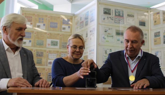 Они же втроём приняли участие в презентации почтовой карточки с литерой «В», посвящённой выставке, расписались на карточках и по очереди погасили их специальным почтовым штемпелем, посвящённым выставке.