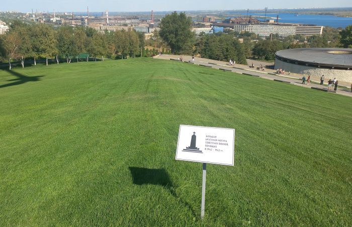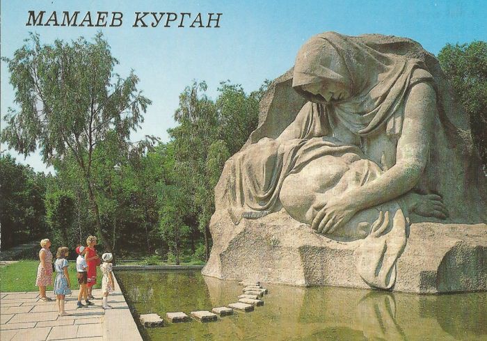 На Мамаевом кургане захоронено много советских воинов. Когда шло строительство комплекса рабочие то и дело натыкались на человеческие останки. Было принято решение собрать их все (всего 34 тысячи человек) и захоронить на холме, на котором стоит сейчас монумент «Родина‑мать».