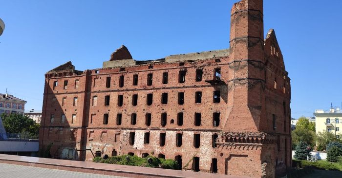 Здание мельницы, разрушенное в дни Сталинградской битвы и не восстановленное как память о войне.