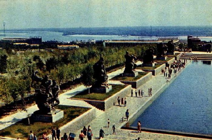 Поднявшись по широкой гранитной лестнице, вы попадаете на площадь Героев, центральную часть ее занимает большой бассейн, символизирующий Волгу, которую отважно защищали советские воины.