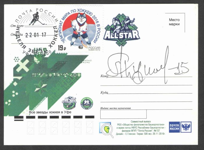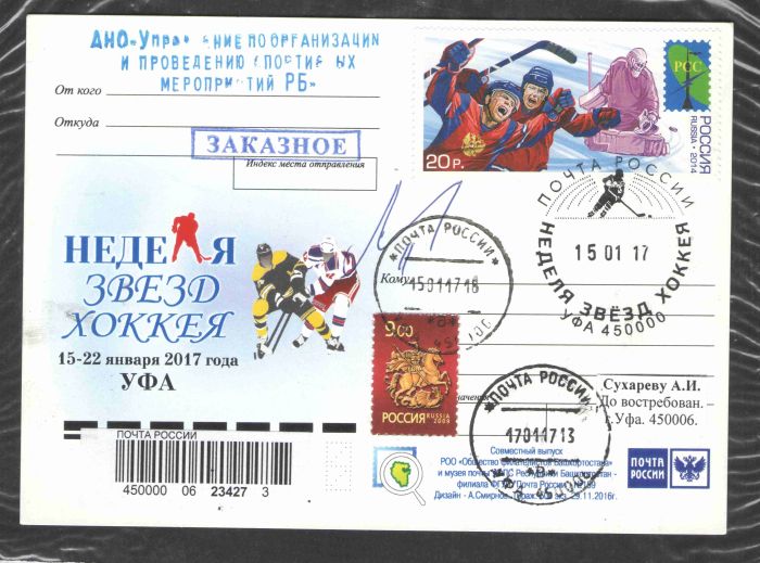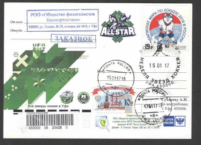 ПК № 174. Все звёзды хоккея в Уфе. 29 ноября 2016 г. Тир.: 500 экз. Карточка прошла заказную почту. Основная м. на ней погашена СШ «Почта России Неделя звёзд хоккея Уфа 450000 15 01 17». Доплатная м. – КШ-лем.