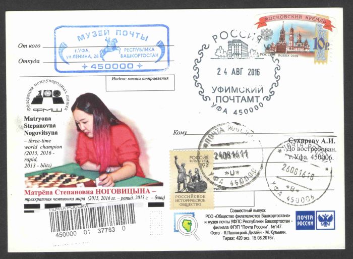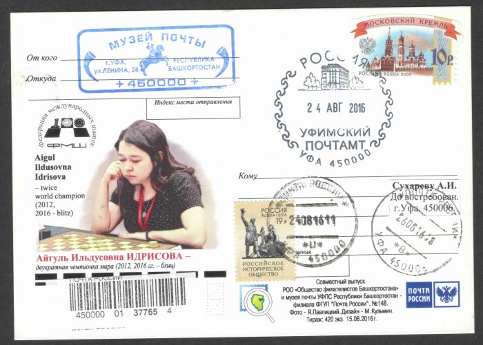 ПК № 164. А.И. Идрисова – шашистка, трехратная чемпионка мира. 15 августа 2016 г. Тир.: 520 экз. Карточка 24.08.2016 г. прошла заказную почту. Основная м. на ней погашена СШ об Уфимском почтамте. Доплатная м. – КШ-лем.
