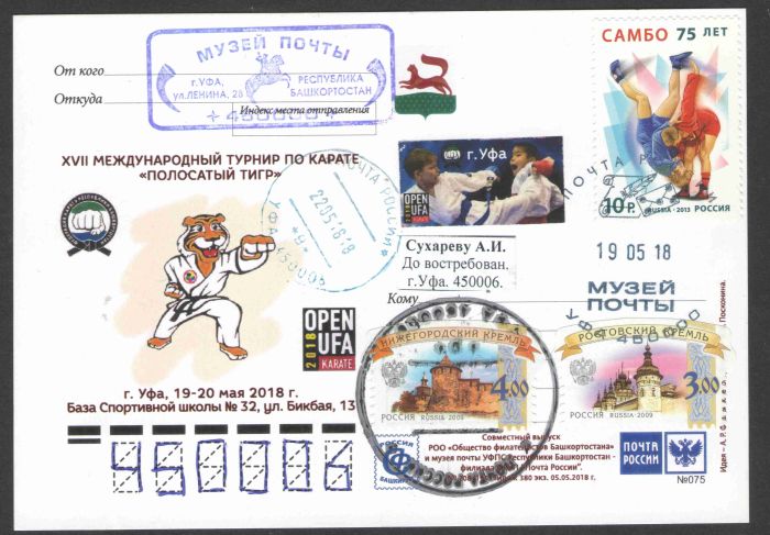 ПК № 208. XVII Международный турнир по карате в Уфе. 5 мая 2018 г. Тир.: 380 экз. Номерная. Карточка прошла заказную почту. Основная м. на ней погашена СШ-лем музея почты. Доплатная м. – КШ-лем. Наклеена тематическая виньетка.