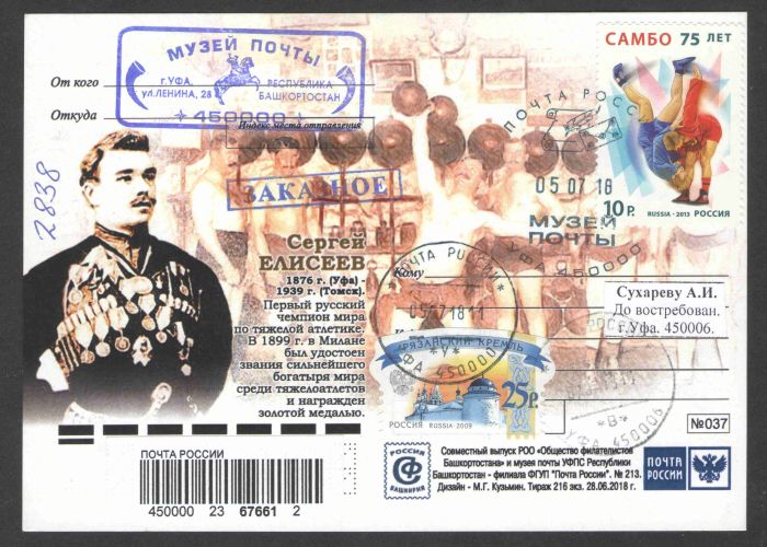 ПК № 213. Сергей Елисеев – первый русский чемпион мира по тяжелой атлетике. 28 июня 2018 г. Тир.: 216 экз. Номерная. Карточка прошла заказную почту. Основная м. на ней погашена СШ-лем музея почты. Доплатные – КШ-лем. На обороте проставлено круглое каше ОФБ.