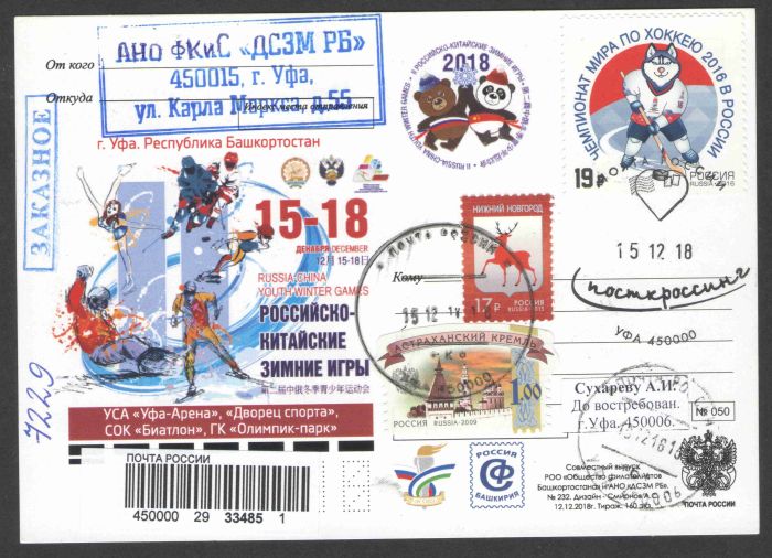 ПК № 232. Уфа. Российско-китайские зимние игры. 12 декабря 2018 г. Тир.: 160 экз. Номерная. На заказной карточке СШ-лем о посткроссинге погашена основная м. Доплатные – КШ-лем. ПК отправлено дирекцией спортивных и зрелищных мероприятий республики (АНО ФКиС «ДСЗМ РБ»).