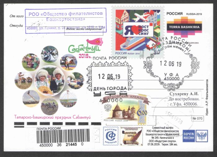 ПК № 249. Татаро-башкирский праздник Сабантуй. 7 июня 2019 г. Тир.: 184 зкз. Номерная. Основная м. погашена СШ-лем «С праздником!». Доплатные – СШ-лем «День города Уфа» и – обычным.