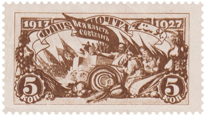 Впервые специальным выпуском почтовых марок была отмечена 5-я годовщина Октябрьской революции. Народным комиссариатом почт и телеграфов РСФСР был объявлен конкурс на создание памятной марки, в котором приняли участие свыше 100 художников.