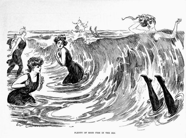 Волны часто окаймляли тексты газетной рекламы. За гидроморфными образами закреплялись целые ряды значений (интересующий нас художник Гибсон изображал пляж как особую социальную среду, посещение пляжа было для его героев возможностью показать хорошие манеры, а морские волны были нарисованы им с удивительной тонкостью). Орнаменты в виде волн украшали книжные и журнальные обложки.