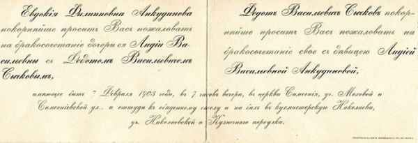С.А. Телина, научный сотрудник МРОКМ им. И. Д. Воронина, в статье «К юбилею Ф. В. Сычкова: материалы художника в фондах музея» сообщает: «Брак Федота Васильевича Сычкова с Лидией Васильевной был заключен 7 февраля 1903 г. в Симеоновской церкви на ул. Моховой (в Москве), венчание было назначено на семь часов вечера, затем гости приглашались к обеденному столу и на бал в кухмистерскую Николаева на ул. Николаевской. Все эти сведения сохранило для нас изысканное приглашение на свадьбу, напечатанное в типографии от имени Евдокии Филипповны Анкудиновой и Ф.В. Сычкова. Лицевая сторона украшена розетками с инициалами «Л» и «Ф».