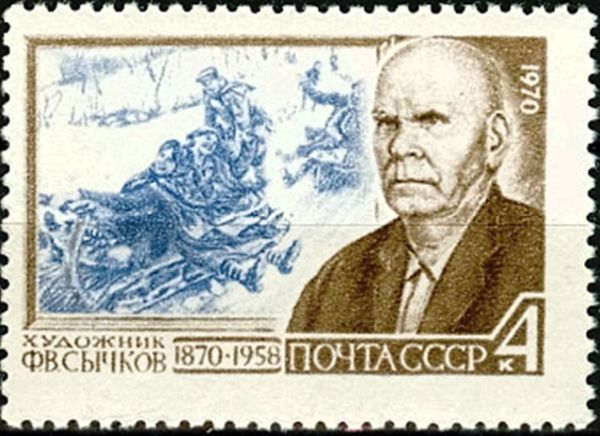 На почтовой марке СССР №3854 по рисунку Н. Присекина, выпущенной Министерством связи СССР в январе 1970 года, портрет этого художника приводится на фоне монохромного воспроизведения фрагмента картины «Катание с гор» (1937 год) из собрания Мордовской республиканской картинной галереи, носящей имя Федота Васильевича Сычкова.