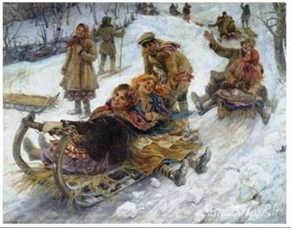 Обратите внимание на то, что на полноцветной версии этого полотна, составившей лицевую сторону почтовой маркированной карточки Министерства связи СССР, напечатанной в 1962 году на Московской полиграфической фабрике Гознака, присутствуют фигуры второго плана — улыбающаяся девушка, держащая в руке верёвку санок, и поднимающийся в гору лыжник. Они отсутствуют на почтовой марке. Отличаются в двух версиях одного произведения и фигуры, виднеющиеся за поднятой рукой молодого человека, сидящего на вторых санях.
