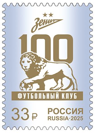 На почтовой марке изображена юбилейная символика футбольного клуба «Зенит»: эмблема клуба, цифра 100, лев с мячом.