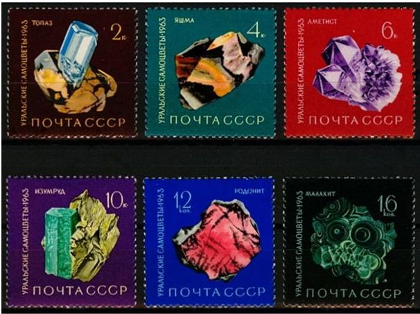 Не удержусь, хотя эта серия и не имеет прямого отношения к Ильменскому заповеднику, упомянуть серию марок СССР 1963 года «Уральские самоцветы», которая стала одной из первых в моей детской коллекции. Не берусь утверждать, что в Ильменских горах есть изумруды, но остальные пять самоцветов (топаз, яшма, аметист, родонит, малахит) присутствуют точно.