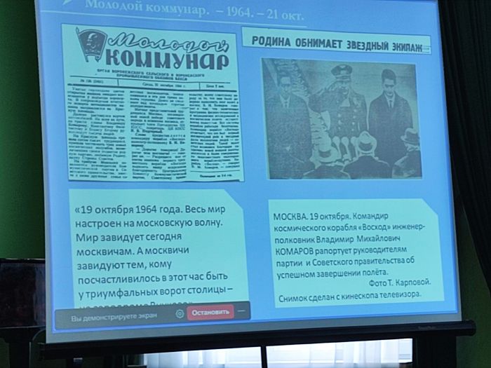 Была рассказана история создания двигательной установки, обеспечившей полет экипажа К. Феоктистова на орбиту, освещена ретроспектива газетных статей тех лет и книг самого Константина Петровича.