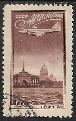 На марках эффектной серии авиапочты 1949 года изображен новейший в то время Ил-12 — первый советский комфортабельный самолет для пассажирских перевозок.