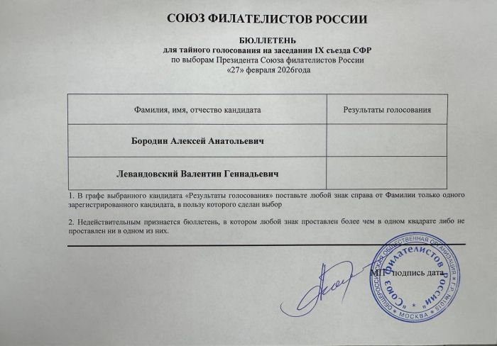 27 февраля 2026 года в Москве прошел очередной IX съезд Союза филателистов России, в рамках работы которого состоялись выборы президента СФР, вице-президентов и Президиума Исполнительного Совета Союза. Также участники ознакомились с результатами работы организации за отчётный период и дали оценку деятельности СФР.