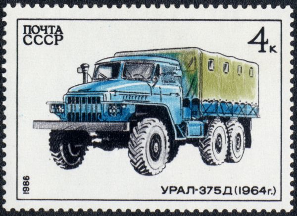 Марка СССР, 1986 г. «Урал – 375Д (1964)». Художник – А.Аксамит.