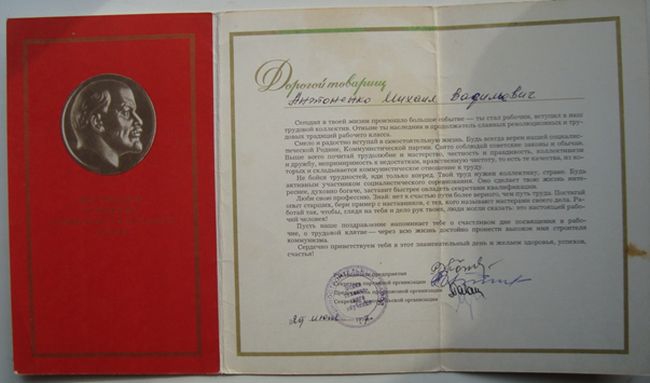 Эта профессия мне памятна не только тем, что я проработал в ней почти два года, но и тем, что, проходя обучение, я познакомился со своей будущей женой. Она работала электромонтажницей на соседнем закрытом участке. Оттуда и запомнил, что токарь работает без перчаток (да и в то время их и не было, разве что рукавицы), — очень уж «возмущалась» моя будущая жена, что оставляю отпечатки рук на её белом халате.