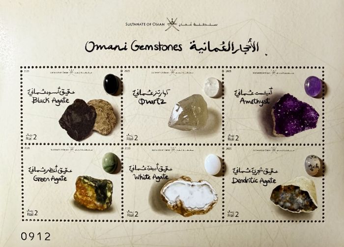 В 2025 году в Омане вышел малый лист из шести марок с изображением драгоценных камней, добываемых на территории страны: аметиста, чёрного, мохового (дендритового), зелёного и белого агатов, кварца. В правом верхнем углу каждой марки закреплены обработанные фрагменты этих камней.