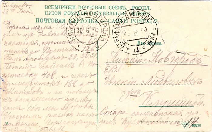 Теперь о третьей почтовой карточке. Она адресована из Дивеева в Нижний Новгород и является типичным паломническим почтовым отправлением (дочери сообщают матери, как проходит путешествие в Саров). Это уже полноценная открытка — типографская, с фотографией «Видъ Серафимо-Дивеевского монастыря съ юго-западной стороны» и проставленным в правом нижнем углу адресной стороны клеймом изготовителя «Ф.Ш.М.» (Фишер в Москве?) с номером «90270».