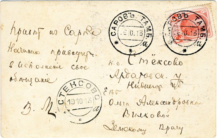 Представляю вашему вниманию три почтовые карточки с оттисками дореволюционных Саровского и Дивеевского почтовых отделений. Две почтовые карточки (далее — ПК) с оттисками саровских штемпелей неразрывно связаны.