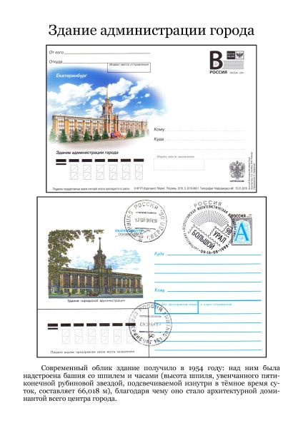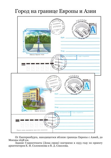 От Екатеринбурга, находящегося вблизи границы Европы с Азией, до Москвы 1658 км. Здание Главпочтамта (Дома связи) построено в 1933 году по проекту архитекторов К.И. Соломонова и В.Д. Соколова.