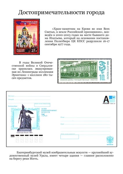 Он пишет: «С огромным удовольствием познакомился с работами филателиста Михаила Антоненко «Путешествие в Миасс» и «ГРЦ имени академика В.П. Макеева». Спасибо, коллега! Продолжая разработку темы «Филателистическое краеведение» представляю на суд филателистов небольшую коллекцию, посвящённую городам и людям Екатеринбуржья».