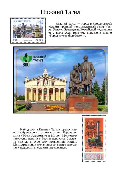 Нижний Тагил — город в Свердловской области, крупный промышленный центр Урала. Указом Президента Российской Федерации от 2 июля 2020 года ему присвоено звание «Город трудовой доблести».