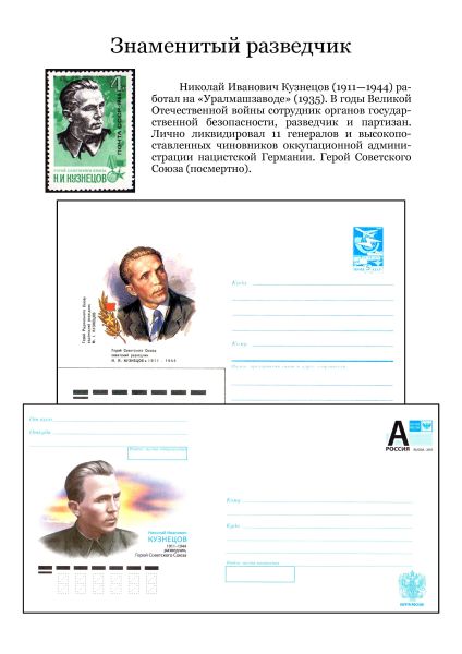 Николай Иванович Кузнецов (1911-1944) работал на «Уралмашзаводе» (1935). В годы Великой Отечественной войны сотрудник органов государственной безопасности, разведчик и партизан. Лично ликвидировал 11 генералов и высокопоставленных чиновников оккупационной администрации нацистской Германии. Герой Советского Союза (посмертно).