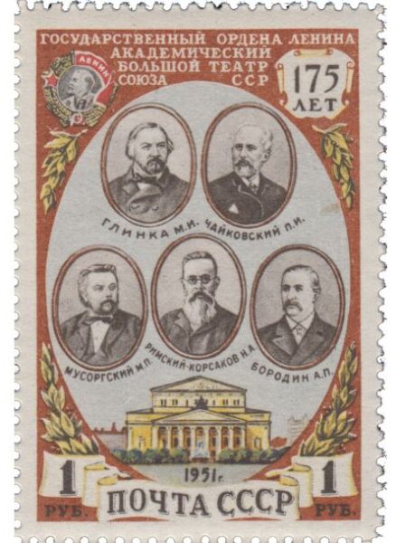Художники-дизайнеры отошли от традиционного показа здания театра на почтовых марках (см., например, почтовые марки 1951г. №1612, 1613), а изобразили на полях блока историческую сцену Большого театра, а на марке блока — эпизод из оперы М. Мусоргского «Борис Годунов» (1948 г.). Фигурная вырубка блока и оформление полей создают визуальный эффект присутствия в зрительном зале театра. Опера «Борис Годунов» — это визитная карточка Большого театра.