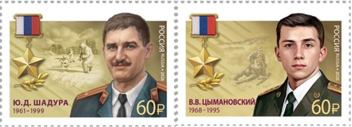 Герои Российской Федерации Ю.Д. Шадура и В.В. Цымановский изображены на почтовых марках.