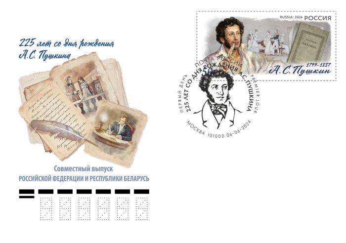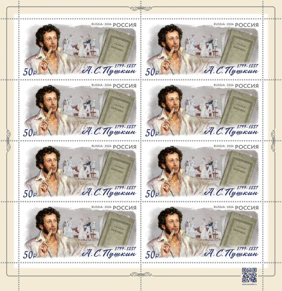 Художник изображает великого поэта в бытовой обстановке, полуодетым. Это было необычным даже для искушенных зрителей. Для марки был выбран фрагмент этого полотна. Талантливая работа Кончаловского сочетается с иллюстрацией к роману «Евгений Онегин» (автор иллюстрации – Иткин), но благодаря удачному дизайну марка, имеющая вытянутый по горизонтали формат, не выглядит перегруженной деталями. А ведь на марке репродуцирован ещё и титульный лист поэмы в шрифтовой подаче девятнадцатого века, так что полиграфический код девятнадцатого века соседствует с изобразительными матрицами века двадцатого. Дизайнер марки М.Бодрова, номинал 50 рублей. В листе с оформленными полями 8 марок.